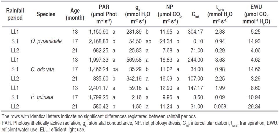The previous response of the species under study represented that O. pyramidale exhibited the highest NP in the dry period (24.31 μmol CO2 m-2 s-1), with the lowest average NP in the rainy period (9.81 μmol CO2 m-2 s-1). C. odorata expressed the highest average photosynthetic rate (16.43 μmol CO2 m-2 s-1) in rainy periods and intermediate in dry periods (11.02 μmol CO2 m-2 s-1), and P. quinata the lowest NP in the two climatic conditions. It can be affirmed that these species are from the group of C3 plants by considering the photosynthetic rates. According to Ocheltree et al. (2014), C3 plants reduce stomatal conductance to minimize water loss; however, the rate of CO2 diffusion also decreases, which reduces the internal concentration of CO2 and the efficiency in carbon fixation by plants (Table 3).