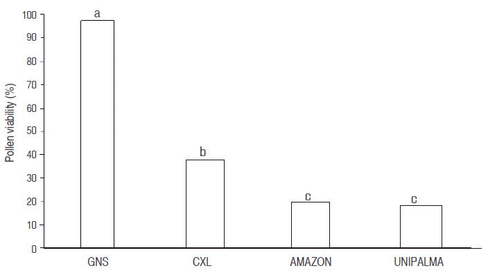 Sanchez and Romero (2013), confirm that the grains of pollen of the hybrid present low percentages of viability and germination due to the fact that they are very varied in size and form with regard to E. oleífera y E. guineensis, and during their formation, they undergo frequent divisions of abnormal cells. The same authors concluded that the low viability of pollen is not an obstacle for the commercial exploitation of the hybrids E. oleífera x E. guineensis. On the contrary, Turner and Gillbanks (1982), affirm that the pollen used in artificial pollination systems must have a viability of no less than 75% at the moment of laboratory observation. Based on this observation, only the pollen of E. guineensis presents the adequate viability for assisted pollination programs.