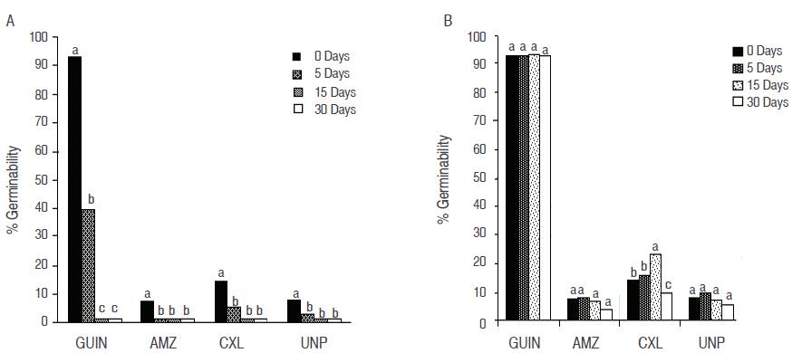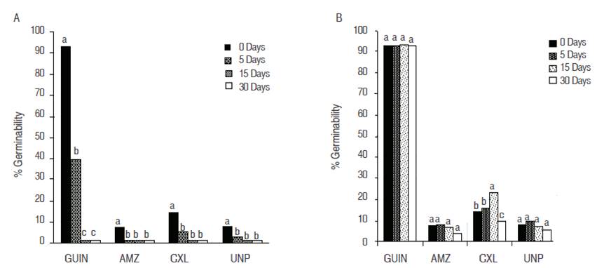 Figure 2: Interaction of the genotype* days stored A. room temperature; B. at -13 °C, in the percentages of pollen germinability of oil palm. Bars with the same letter do not differ statistically (P<0.05).