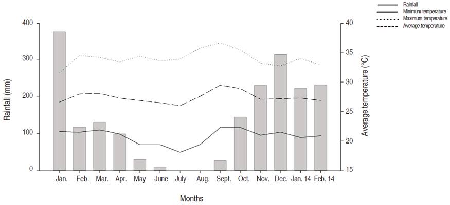 Figure 1: Monthly weather data: Total rainfall and average highest and lowest temperature, obtained from the automatic weather station (INMET, 2014).