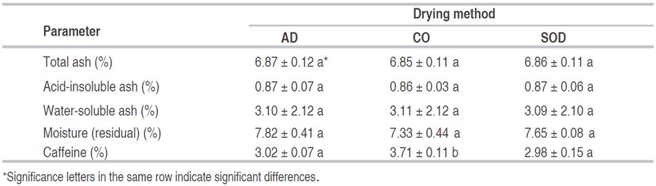 The sample dried in a conventional oven showed a slight increase in the concentration of caffeine in comparison with the other drying methods (AD and SOD). Although, AD and SOD methods did not affect the caffeine concentration. The physical properties such as moisture, total ash, water soluble ash and acid insoluble ash, did not differ significantly for any method. The chemical groups found in all the samples were flavonoids, phenols, tannins, reducing compounds, saponins, triterpenes-steroids, quinones, fats and alkaloids.