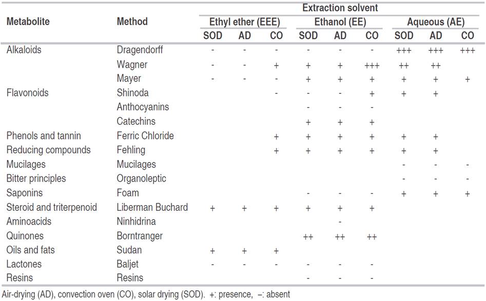 Qualitative phytochemical analysis was performed using ethyl ether, ethanol and water solvents according to the procedure described by Miranda and Cuellar (2001). Briefly, 30 g of sample was weighted and 300 mL of solvent of increasing polarity was added, each one after 24 h of successive maceration extraction at temperature room. The presence or not of the following chemical compounds was determined: oils - fats; alkaloids; flavonoids; quinones; saponins; lactones; phenol and tannins; reducing sugars; mucilages; bitter principles; steroid and triterpenoid; aminoacids; resins.