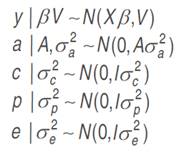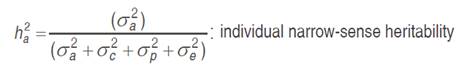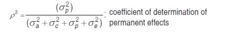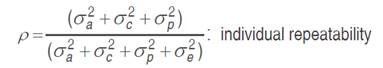 Individual genetic parameters were calculated by REML: Vg: genotypic variance between full-sib progenies, (1/2) additive genetic variance, plus (1/4) of the dominance genetic variance, ignoring epistasis; Vplot: environmental variance among plots; Vperm: variance of permanent effects; Vwithin: residual variance within plot; Vph: individual phenotypic variance; h2a: individual narrow-sense heritability, ignoring the fraction (1/4) of the dominance genetic variance; c2plot: coefficient of determination of plot effects; c2perm: coefficient of determination of permanent effects; h2gd: genetic heritability within plot, ignoring the fraction of the dominance genetic variance; CVe: residual coefficient of variation; CVg: coefficient of genotypic variation among progenies; CVr coefficient of relative variation (CVg/CVe).