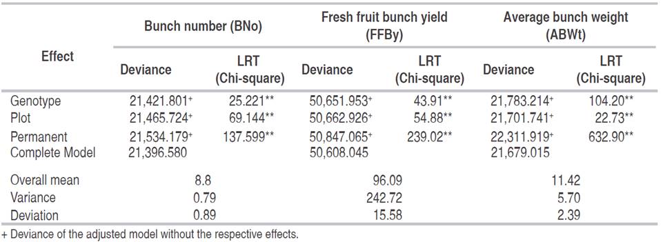 Deviance analysis (ANADEV) was performed, considering the model adjusted for genotype, plot and permanent effect, which proved significant by the likelihood ratio test (LTR), at 1% and 5% probability by the chi-square test, for the traits bunch number (BNo), fresh fruit bunch yield (FFBy) and average bunch weight (ABWt) of oil palm (Table 1). The significant genotype effect indicated the existence of genetic variability among the 27 families in the three tests for the three traits under study. Regarding the plot effect, significant environmental differences were also demonstrated between plots in each replication and test. This analysis revealed the existence of highly significant permanent differences (permanent environmental and non-additive effects) among plants in the five years of evaluation.
