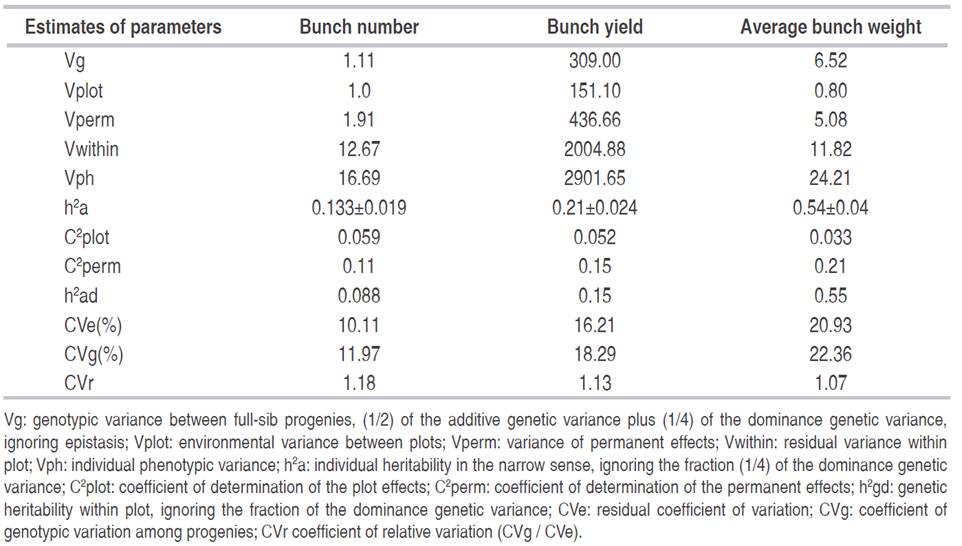 Table 2: Estimates of genetic parameters for the variables: bunch number, bunch yield and average bunch weight in three trials of Dura x Dura full-sib progenies.