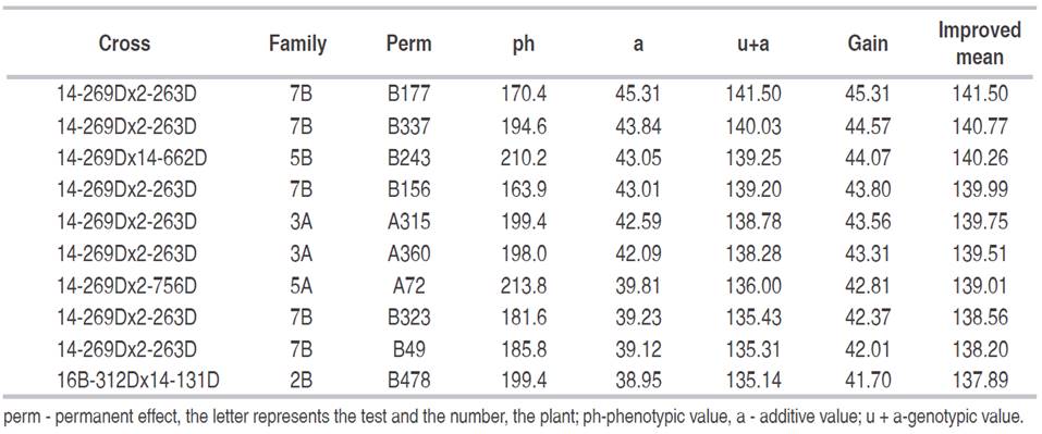 Based on the similarity between groups, by the average rank and the additive values estimated by BLUP, the 10 best plants were selected both for mother plants and for a new selection cycle.