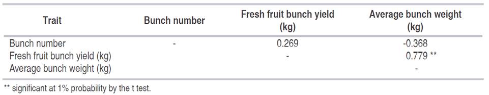 The correlations for bunch number-BNo, with fresh fruit bunch yield -FFBy and with - average bunch weight-ABWt were low, while for fresh fruit bunch yield-FFBy and average bunch weight-ABWt, the correlation was high and positive (0.78%).