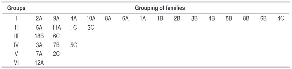 Table 6: Clustering of families assessed by the Tocher method, using the mean Euclidean genetic distance.