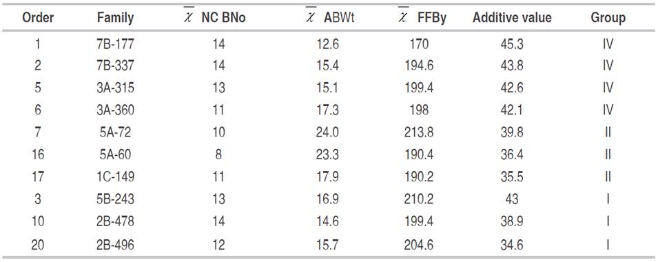 It was observed that the families 6C and 18B, used as controls in test 13B, and Caseta were allocated in group III. These two families were derived from the cross 1050D x 14-13A-491P and the third control (cross 14-93D x 13A-527P), evaluated in test 3A, was allocated in group VI. Thus, the selection of plants for recombination initially identified the best-performing families for the traits BNo, FFBy and ABWt simultaneously (Table 5), in each similarity group (Table 6), by the average rank values.