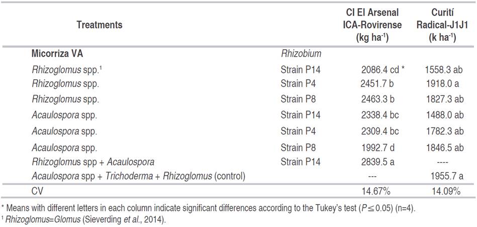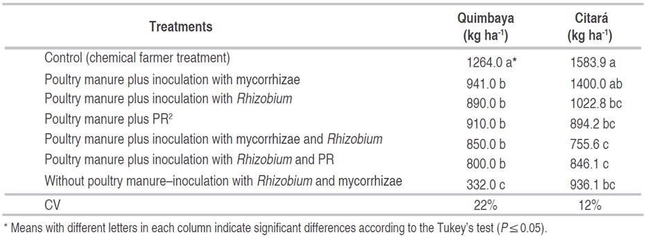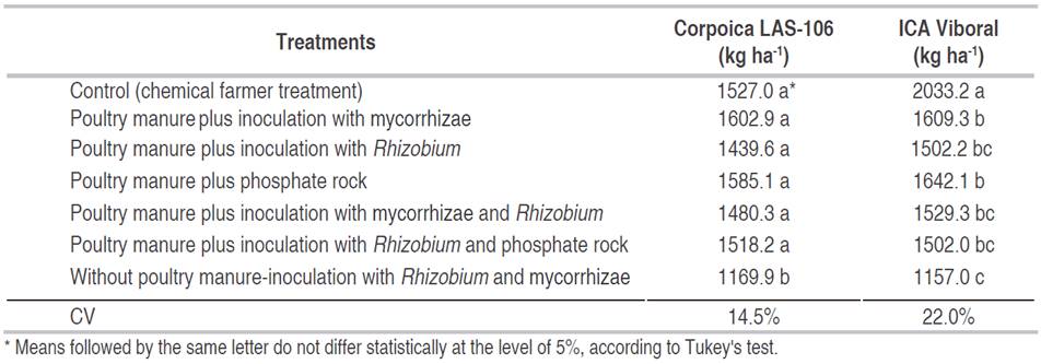 At C.I. La Selva, when performing a combined analysis during two consecutive cycles, in Corpoica 106 and ICA-Viboral, significant differences were present among treatments. As it can be seen in Table 1, the yield obtained with chemical fertilization in the variety Corpoica 106 was equal to that obtained with organic and biological fertilization, either with double inoculation, mycorrhizae plus Rhizobium, and/or with the application of PR. This agrees with several authors who report a positive effect of the different strains, both in their simple as in its combined forms, presenting the greatest effects when double inoculations were used (Saravesi et al., 2014; Galindo and Clavijo, 2009; Caldera et al., 2013; Clua et al., 2013; Granda et al., 2016; Romero et al., 2016).