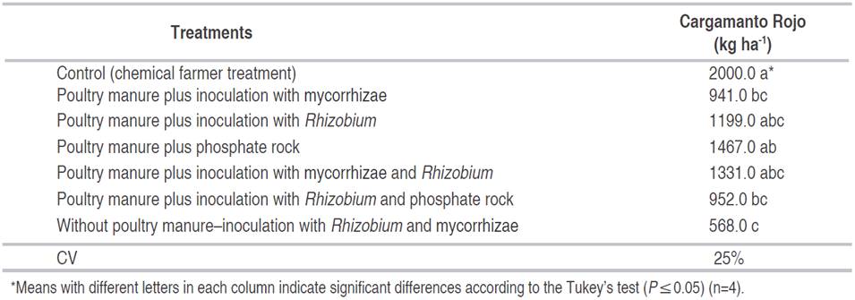 In Pasca, the yield in the bean "Cargamanto Rojo" fluctuated between 568 and 2000 kg ha-1. Table 3 shows significant differences among the treatments; the chemical farmer treatment (control), does not differ statistically from the treatments of poultry manure plus Rhizobium, phosphate rock and mycorrhizae and Rhizobium. These yields, despite being from medium to low, the trend they present is the same of that obtained in C.I. La Selva with the ICA-Viboral bean, probably because poultry manure could improve the physical and biological conditions and help the activity of mycorrhiza and Rhizobium in the soil.