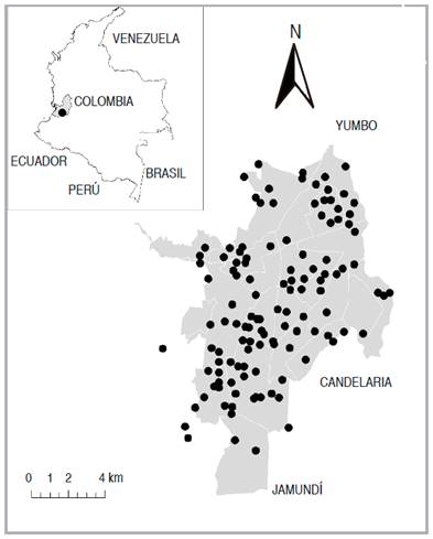 Figure 1: Studied area of Cali’s urban zone and its administrative division by communes. Black points represent the respondents’ location.
