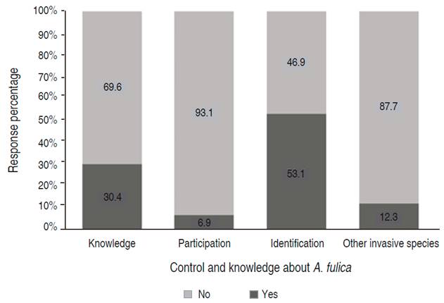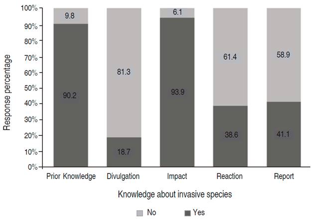 90% of interviewed people stated that they knew what an invasive species was, and 94% thought they were dangerous, but 81% had not witnessed a divulgation campaign on the issue. 61% of people did not know what to do if they found these species and 59% did not know to which environmental authority they should report the problem (Figure 2).