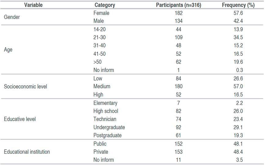 The questionnaire consisted of 23 open-ended and multiple-choice questions. The multiple-choice questions used language categories such as “Yes or No” or a scale of 1 to 10, where 1 was the minimum score and 10 the maximum score. The questionnaire was designed using a virtual application for its later broadcasting using digital and printed media. The statistical universe considered for census accuracy estimation was the population of Cali, and only one questionnaire per person was recorded. For the digital broadcasting, the electronic address of the questionnaire was divulged on social media and by email between July 2017 and February 2018, reaching 1,200 people. The following criteria were used to stop receiving questionnaire responses: (i) Obtaining the desired statistical sample, 385 answered surveys considering physical and digital broadcasting, corresponding to a 95% confidence level and 5% error, (ii) total coverage of the communities in the Cali’s urban area, (iii) the distribution of surveys by neighborhoods in Cali, and (iv) the number of days without replies or with only one reply to digital questionnaires.