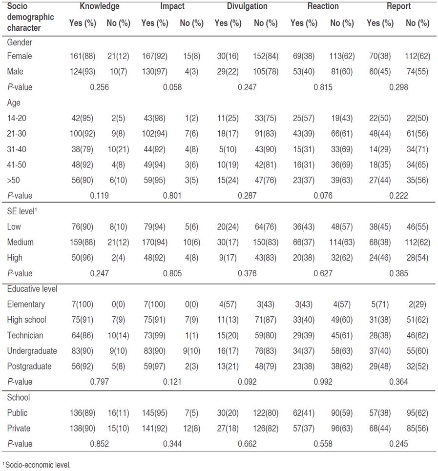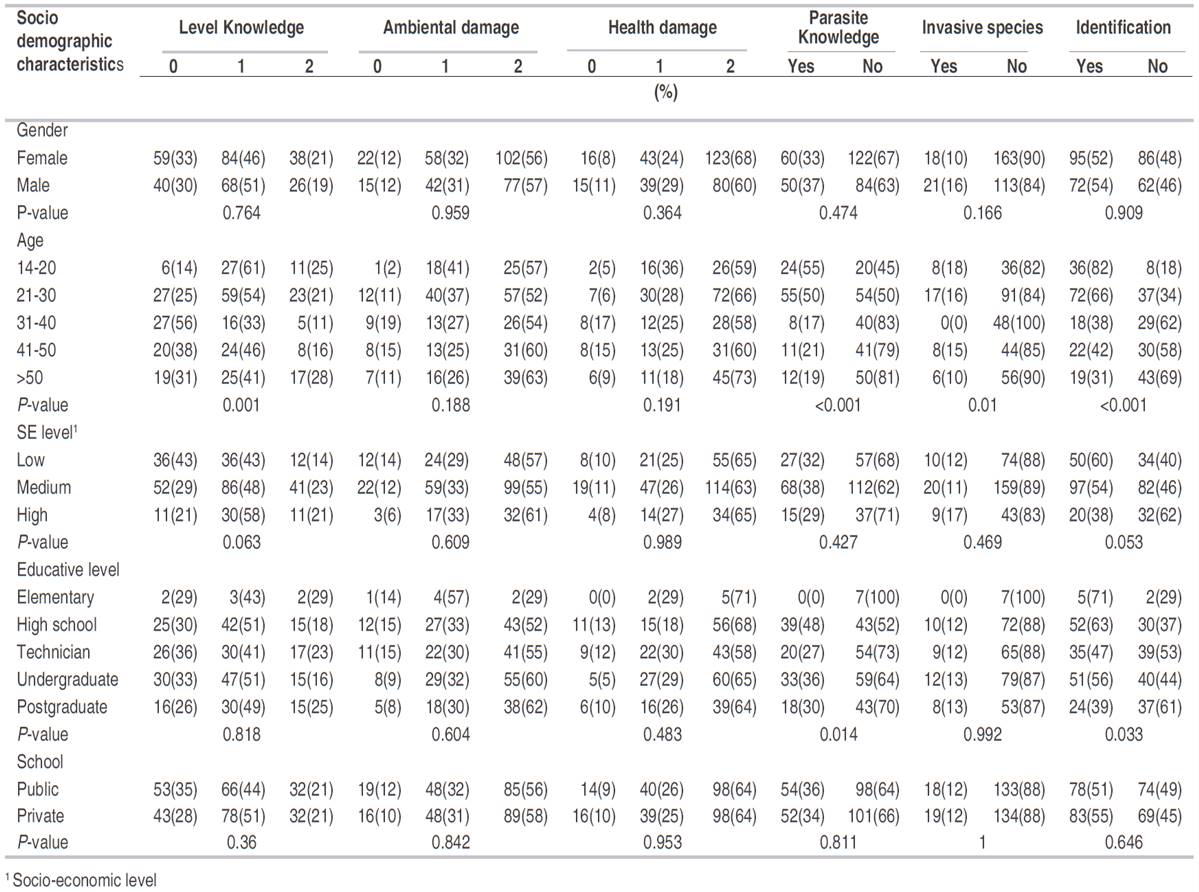 Table 3: Relationship between socio-demographic characteristics and perception variables on A. fulica in the city of Cali. 0 (low), 1 (medium), 3 (high).
