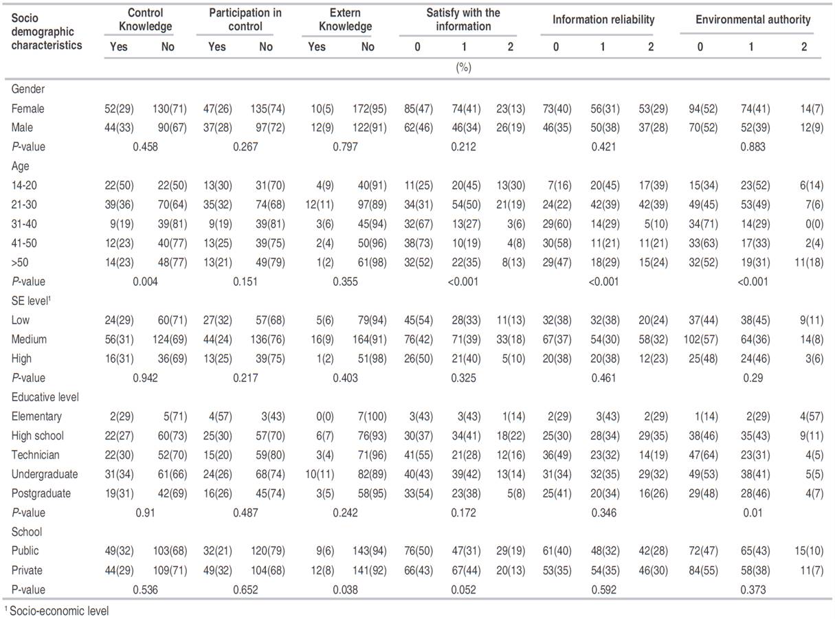Table 4: Relationship between socio-demographic characteristics and perception variables on control of A. fulica in the city of Cali. 0 (low), 1 (medium), 3 (high).