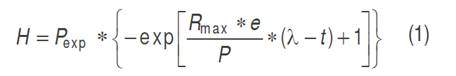 Where: H is the cumulative production of hydrogen (mL), λ the lag phase time (h), P is the potential production of hydrogen (mL), R max is the maximum rate of hydrogen production (mL h-1) in the time interval, t corresponds to the hours per day of biohydrogen production and e is 2.718281828 (Valdez-Vazquez and Poggi-Varaldo, 2009). The cumulative production of hydrogen (H) was obtained by adding the liters registered in each test every day, from the first day until the presence of hydrogen in the gas ceased. The lag phase time corresponded to the days elapsed from the moment the lime was added to the bioreactor until the production of hydrogen began. The potential production of hydrogen (P) was the cumulative total of the production in each test, while the maximum production rate was given by the ratio between the maximum value of hydrogen production and the hours that were required for it in each test. The fit of the experimental data to the Gompertz model (R² and R²adj) was done with the Curve Fitting Tool (CFTools) from Matlab, version 2012®.