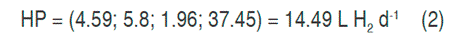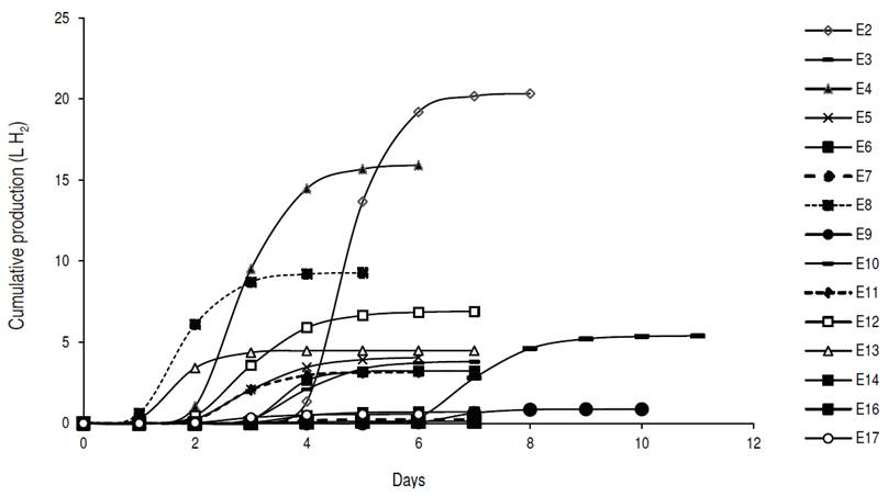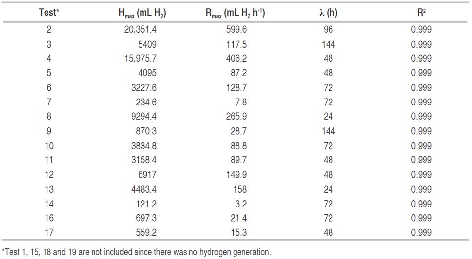 The CPH increased until reaching its asymptotic value Hmax. At this point, the daily hydrogen production ceased due to the depletion of the substrate given that the fermentations were made in batch. The experimental data were fitted appropriately to the modified Gompertz logistic model, obtaining multiple correlation coefficient higher than 0.99 (Table 3).