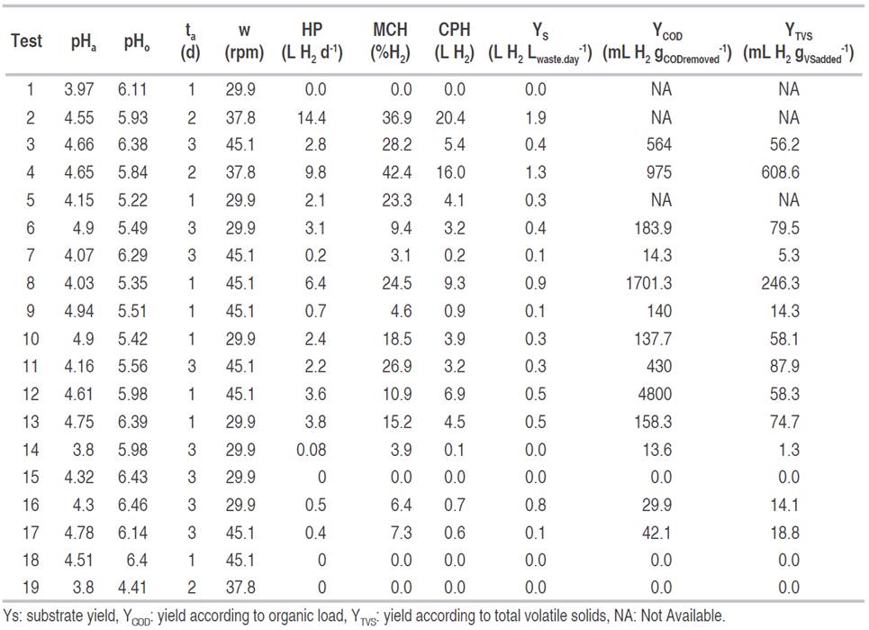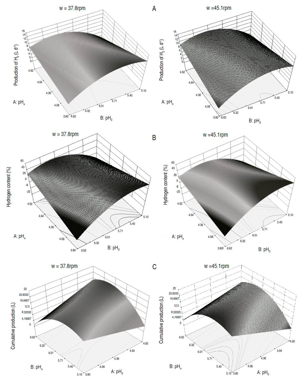 The maximum daily and cumulative production were obtained for pHa, pHo, and stirring of 4.55, 5.93, and 37.8 rpm, respectively. In turn, the highest hydrogen content in the gas was reached for pHa, pHo, and stirring of 4.65, 5.84, and 37.8 rpm, respectively. These results coincide with those given by other authors such as Fernández et al. (2010), who using food waste under these conditions and with mesophilic temperature obtained high hydrogen production. Other authors (Valdez-Vazquez and Poggi-Varaldo, 2009) achieved up to 58% of hydrogen in the gas for a mesophilic regime, using an inoculum from wastewater.