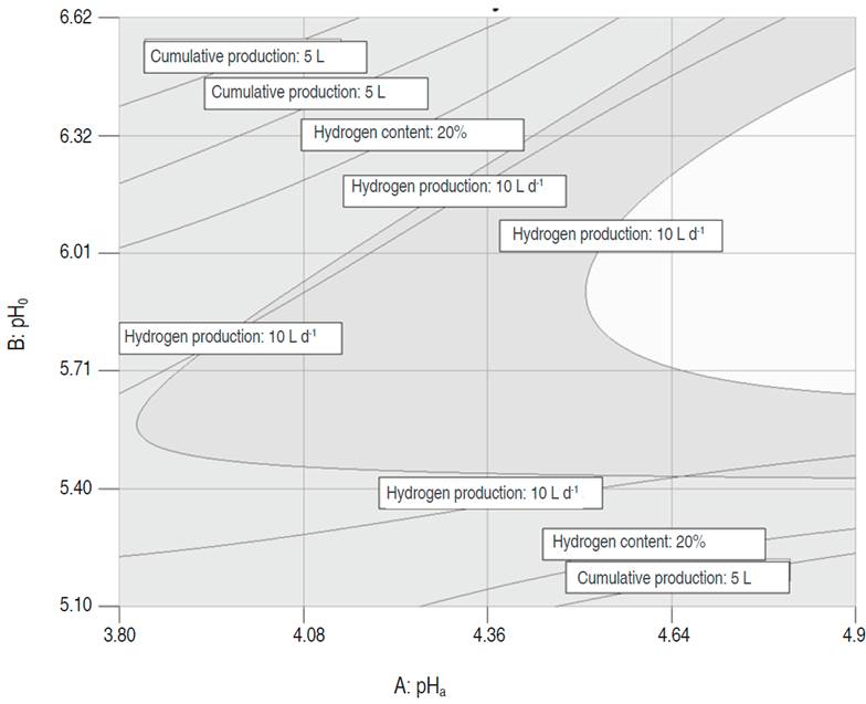The graphical optimization displays the area of feasible response values in the factor space. Figure 3 shows the superposition of the contour plots of each variable, which allowed to find the intersection area that provided the best values for the multiple responses. The regions that did not meet the optimization criteria are shaded in dark gray, and in light gray the optimization area. The above-mentioned area was found for pHa values between 4.5 and 4.95, pHo between 5.6 and 6.3, acidification time of 2 d and stirring of 37.1 rpm; reaching a production of 14.9 L H2 d-1, a maximum content of hydrogen of 44.2% and a cumulative production of hydrogen of 22.8 L H2.