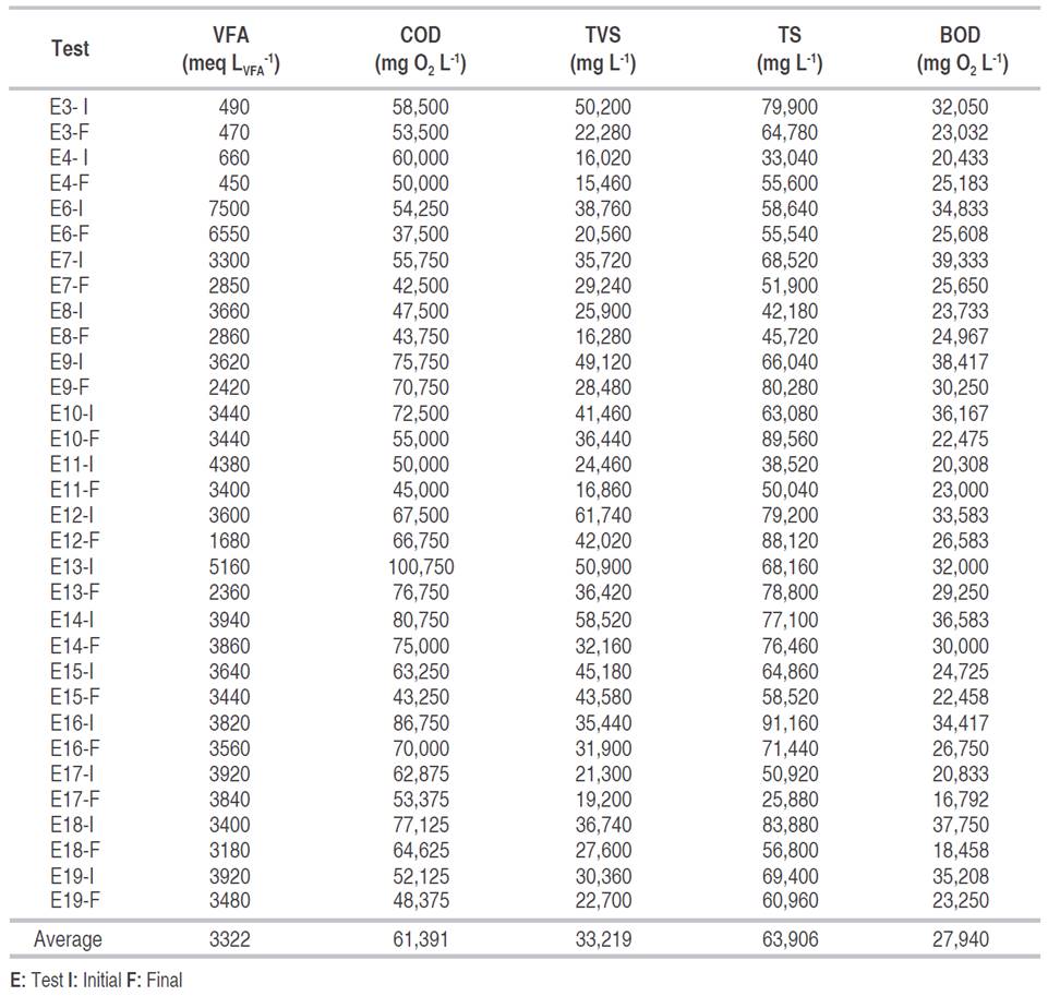 A set of tests were structured based on an experimental design of central composition with four factors and two levels in each factor. The levels of the factors were taken from results achieved in preliminary tests (data not shown). The substrate used corresponded to a mixture of organic waste of fruits and vegetables not suitable for consumption due to mechanical damage and phytosanitary problems, coming from the Central Mayorista de Antioquia (CMA). These were reduced in size and feed to a reactor in a 1:1 ratio between water and substrate. The same waste composition was used in each test. The physicochemical analysis that was performed on the substrate included the determination of the Biochemical Oxygen Demand (BOD), Chemical Oxygen Demand (COD), Total Soluble Solids (TSS), Total Volatile Solids (TVS), and Volatile Fatty Acids (VFA). For this procedure, two samples of 500 mL were taken at the beginning and the end of each fermentation. The concentrations of BOD (5210-B), COD (5220-B), VFA, TSS (2540-B) and TVS (2540-E), were carried out according to the analytical methods of the Standard Methods for the Examination of Water and Wastewater of the APHA-AWWA-WEF, 19th edition of 1995.