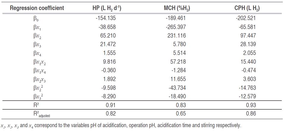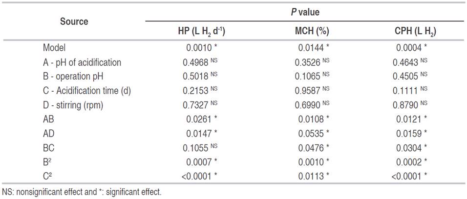 The analysis of variance for the different response variables according to a second-order polynomial quadratic model shows that in each variable the models are statistically significant (P <0.05, Table 4). Also, in none of the cases, there is influence of the individual effects. However, two of the quadratic effects (B2 and C², operation pH and the acidification time, respectively) and combinations (AB and AD), have a statistically significant effect in the hydrogen production. The interaction between BC is significant only for the maximum content of hydrogen (MCH, %), and the cumulative production of said gas (CPH, L H2).
