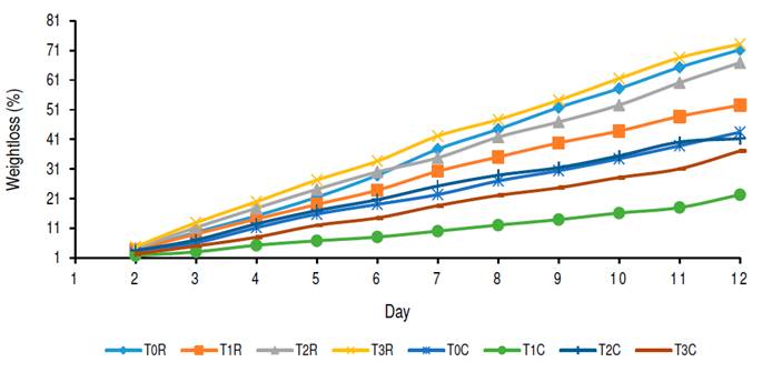 Figure 1 shows a considerable weight loss of the treatments at room temperature in relation to those of refrigeration. This is because, after fruits are harvested, physiological changes occur, such as perspiration (Fernández et al., 2015); and because the fruit is constituted mainly of water (72 - 95%). There is a great dehydration or wilting, which controlled by refrigeration avoids the loss of water that is produced by evaporation (Pelayo and Castillo, 2002).