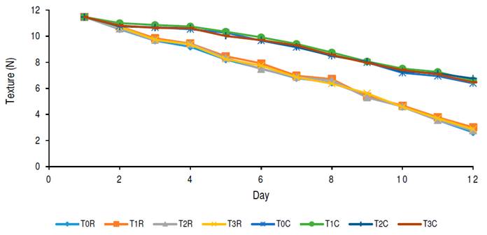 Texture. The loss of firmness constitutes one of the most significant physiochemical changes; it is associated with the loss of water, generated through perspiration and respiration of the fruit. As a result, wilting and loss of consistency occur. It is one of the main factors used to determine fruit quality and post-harvest shelf life (Acuña, 2009).
