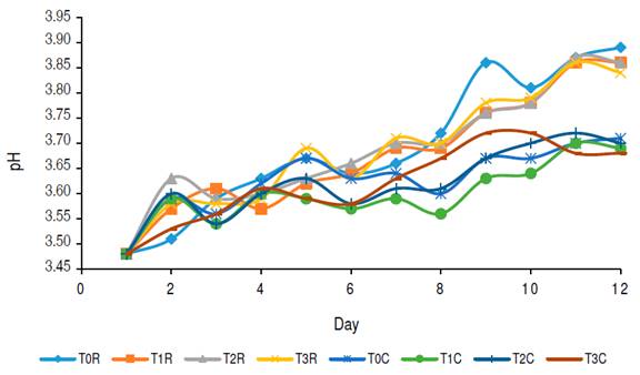 pH and titrable acidity. In regard to the pH variable, reference studies such as those of Nunes (2007) report values between 3.4 - 3.75. In this research these values remained until the eighth day, which correspond to the treatments that are at room temperature, but until day 12 for those that are in refrigerated conditions (this was because bacteria and fungi use, as a source of energy and nutrients, the components present in food, such as sugars, amino acids, and phenolic compounds). In this case, organic acids or glucose may be produced. The production of these compounds causes an increase in the concentration of OH-ions, which results in an increase in pH. This type of process is what causes food to deteriorate (Fennema, 1996).