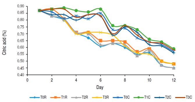 The acidity reduction coincided with the pH increase. The cause was the use of organic acids as an energy source to support the process of senescence of the fruit (Chicaiza, 2015). In addition, it must be considered that the organic acids present in the food influence the taste, color and stability of the same. Acidity values can be very variable, as in fruit. Citric acid can constitute up to 60% of the total soluble solids in the edible portion (Figure 5).