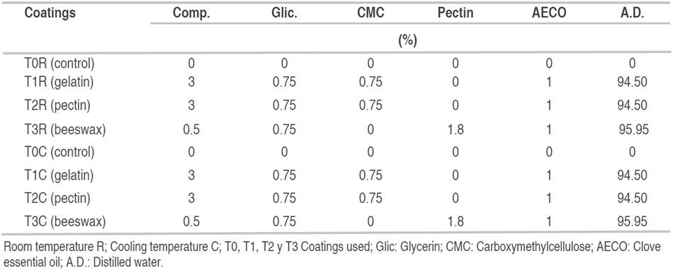The fruit was washed and disinfected by immersion in ozonated drinking water for 15 min. Then, left to dry; after that, the coating was applied by dipping the fruit and leaving it to drain for 1.5 min. Finally, it dried at temperature of 14 - 24 °C until its compaction. The storage was carried out on plastic trays, at an ambient temperature of 13 °C, with a relative humidity of 66.30%, and at refrigerated temperature of 4 °C, with a relative humidity of 95% (FRN - ESPOCH, 2016).