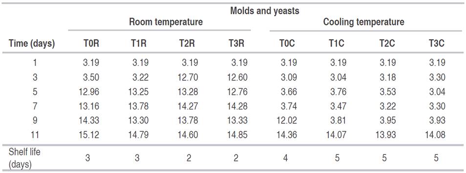 Molds and yeasts.In regard to the parameter molds and yeasts, reference studies such as those carried out by Frazier and Westhoff (2003); report that in order for a fresh fruit to be consumed, without causing any health risk, it must possess a range acceptable to oscillate between 3 log CFU mL-1 and 4 log CFU mL-1. In this research, these values remain until the ninth day in treatments with refrigerated coatings; other treatments are outside the parameter set from the third day.