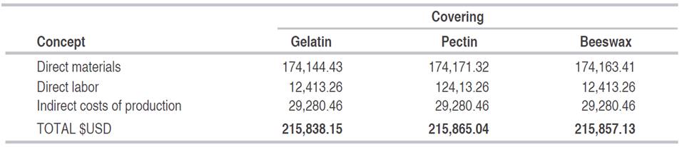 All production costs were projected for one year, with a production capacity of 300 kg of strawberry daily, using 75% capacity. In Table 3, production costs can be seen for obtaining the three types of coatings.