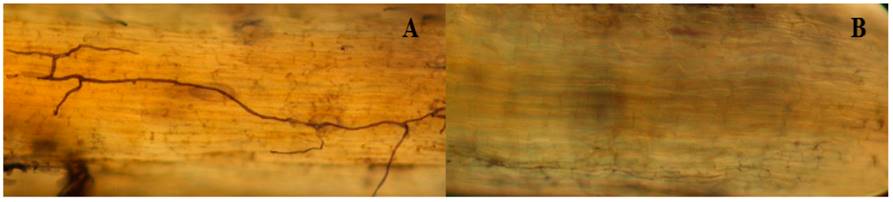 Figure 1: Presence and absence of arbuscular mycorrhizal fungi in roots of Gmelina arborea. A. root inoculated with an Arbuscular Mycorrhizal Fungi (AMF) (Rhizoglomus fasciculatum) (40x); B. root uninoculated (40x).