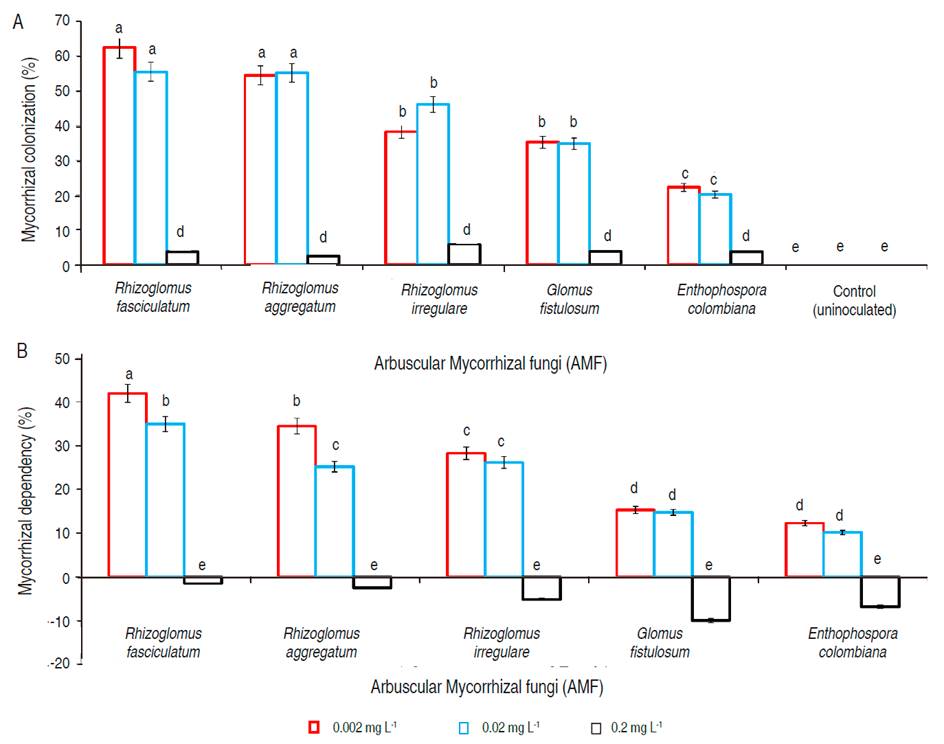 Figure 2: A. Mycorrhizal colonization; B. Mycorrhizal dependence in Gmelina arborea inoculated with five species of Arbuscular Mycorrhizal Fungi (AMF). P levels evaluated in the soil solution were 0.002, 0.02 and 0.2 mg L-1. Statistical analyzes were performed for each level of P and each AMF species evaluated. Equal letters on the bars represent no significant differences with a significance level of 95%. Lines on the bars represent standard error of the mean.