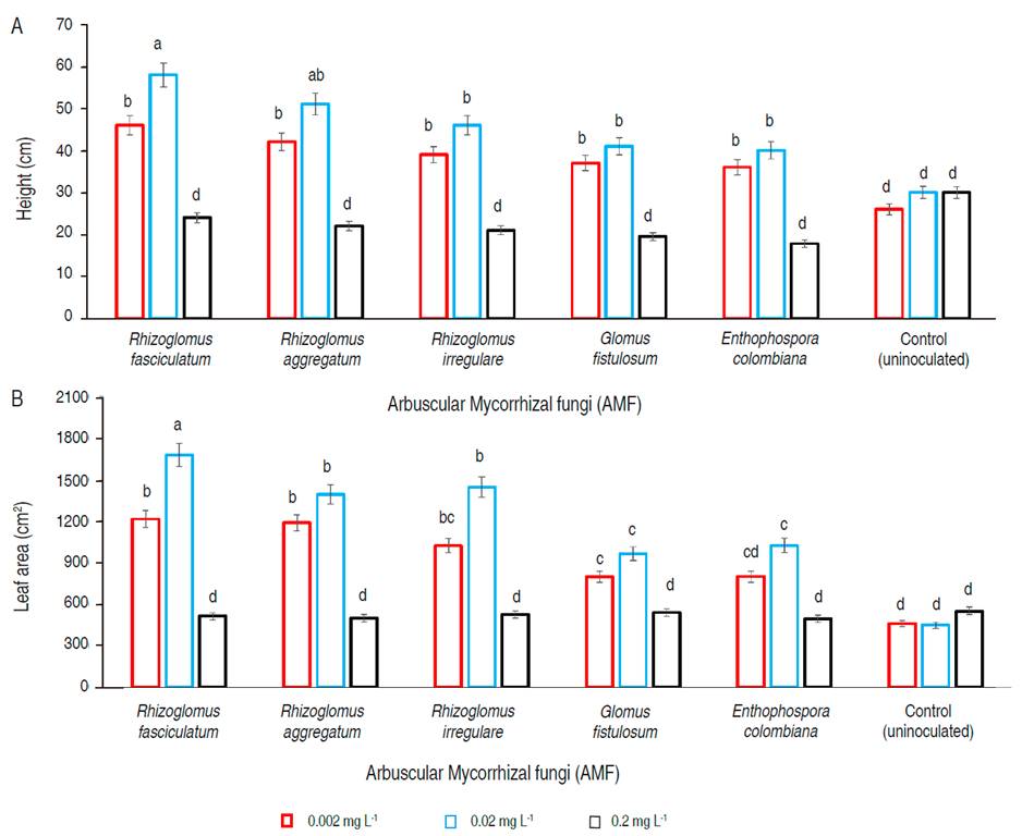 Figure 3: A. Height; B. leaf area of Gmelina arborea inoculated with five species of arbuscular mycorrhizal fungi. P levels evaluated in the soil solution were 0.002, 0.02 and 0.2 mg L-1. Statistical analyzes were performed for each level of P and each AMF species evaluated. Equal letters on the bars represent no significant differences with a significance level of 95%. Lines on the bars represent standard error of the mean.