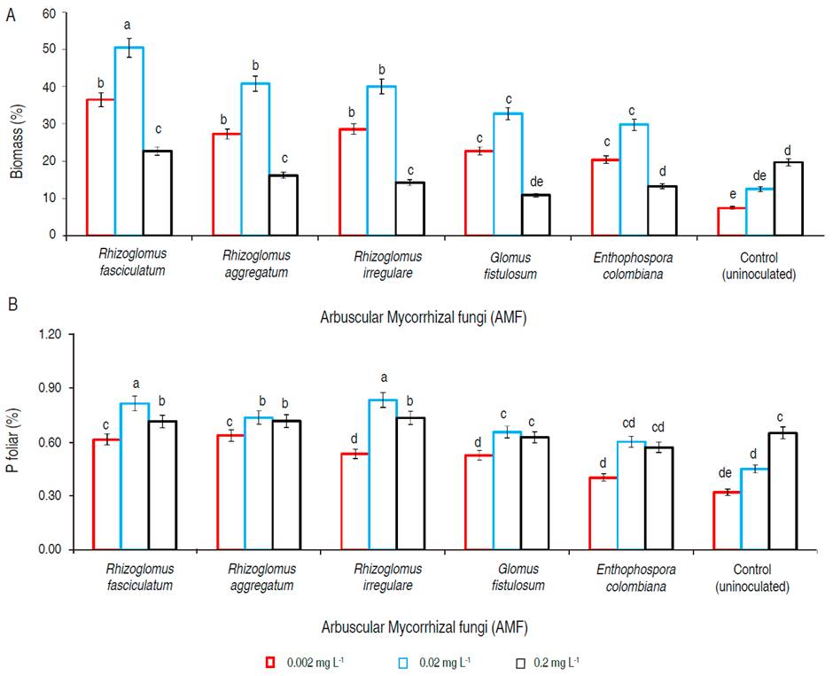 Figure 4: A. Biomass; B. foliar P of Gmelina arborea inoculated with five species of arbuscular mycorrhizal fungi. P levels evaluated in the soil solution were 0.002, 0.02 and 0.2 mg L-1. Statistical analyzes were performed for each level of P and each AMF species evaluated. Equal letters on the bars represent no significant differences with a significance level of 95%. Lines on the bars represent standard error of the mean.
