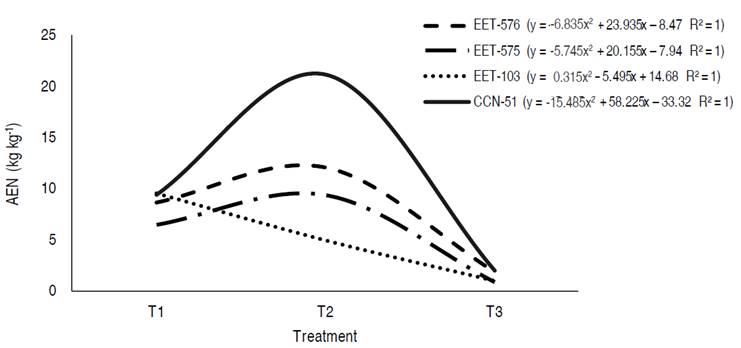 Meanwhile, the highest nitrogen agronomic efficiency (AEN) was seen in clone CCN-51 in the T2 treatment with 21.19 kg kg-1, which means that, for each kilogram of nitrogen applied, the yield increased by 21.19 kg of dry cacao, followed by clone EET-576 in T2 (12.06 kg kg-1), EET-103 in T1 (9.5 kg kg-1), and EET-575 in T2 with 9.39 kg kg-1 (Figure 1). These AEN values exceeded those reported by Puentes et al. (2014a); considering that there was greater fractionation (three times) concerning the mentioned study. CCN-51 excelled in terms of the AeN in the edaphoclimatic conditions of this experiment, surpassing the other clones.