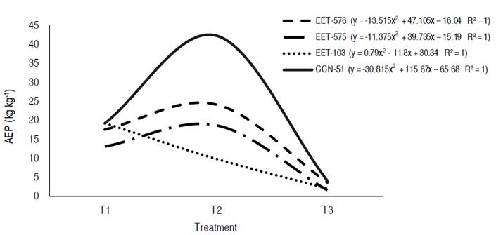 In phosphorus (Figure 2), clone CCN-51 showed the highest agronomic efficiency in T2 (42.39 kg kg-1), followed by clone EET-576 in T2 (24.11 kg kg-1), EET-103 in T1 (19.33 kg kg-1), and clone EET-575 in T2 (18.78 kg kg-1), and the lowest efficiency was seen in T3 for the four clones. Similar results were obtained by Puentes et al. (2014a); however, the AEP values were higher because of the low availability of phosphorus in the experiment soil, making the response to fertilization more efficient, as suggested by Díaz et al. (2014) and Covarrubias et al. (2005).