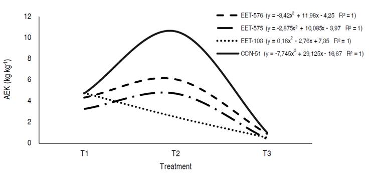 Figure 3 shows that the higher AEK values were in T2 for clones CCN-51, EET-576, and EET-575, with an increase of 10.6 kg, 6.03 kg, and 4.7 kg, respectively, for each kilogram of potassium applied with the fertilizer, while EET-103 presented its highest value in T1 (4.75 kg kg-1). These results are higher than those reported by Puentes et al. (2014a), which is considered normal since the plants do not respond efficiently when K concentrations are high in the soil (Marschner, 1995), as happened with the potassium in the experiment soil.