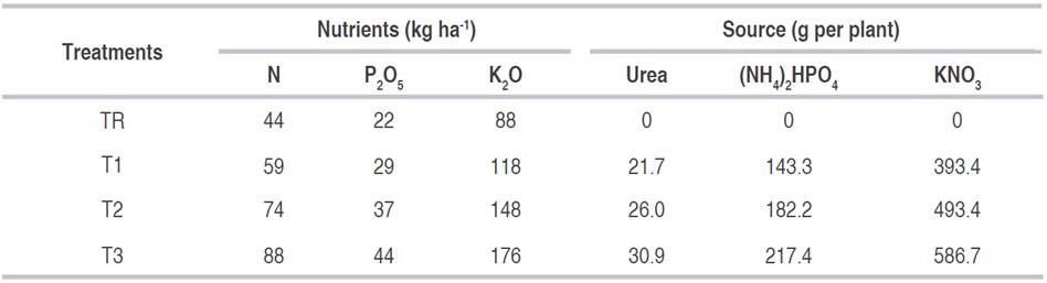 The evaluated treatments included different doses of N-P-K, they were designed using the treatment with the highest yield obtained by Puentes et al. (2014a) and the nutrient ratios of 2:1 for N/P and 1:2 for N/K. Meanwhile, T2 was similar to the one evaluated by Puentes et al. (2014a), and, according to this treatment, T1 was 20% less, TR was 40% less (natural N-P-K concentration of soil), and T3 was 20% more than T2 (Table 2).