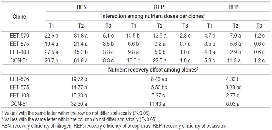 The recovery efficiency of N, P, and K showed highly significant differences (P<0.01) because of the clone and treatments according to the Tukey test (Table 3).