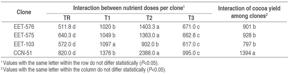 The obtained yields exceeded the values reported by Amores et al. (2009) for clones EET-576 and CCN-51, by 16.6% and 81.9%, respectively, while EET-575 presented a 9.8% lower yield. These values also surpassed those reported by Sánchez et al. (2015), by 127% for CCN-51 and 150% for EET-103. These results differ with the previous authors because the soil of the studied area presented adequate conditions for the development of cocoa (Amores, 1992). Therefore, it is suggested to perform this type of research in all cocoa-producing areas at the national level.