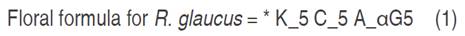 Flowers collected at anthesis (fully opened flowers) were inspected using a Leica EZ4 stereoscope. The morphological characteristics of the flowers, as suggested by Strasburger (1994), were evaluated and classified for external (chalice and corolla) and internal verticils (androecium and gynoecium). Finally, the floral formula of R. glaucus was constructed.