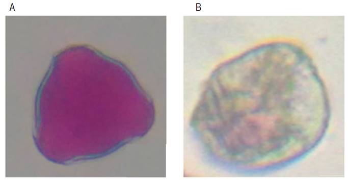 Figure 1: Pollen grains of R. glaucus. A. Viable pollen grain; B. Non-viable pollen grain.