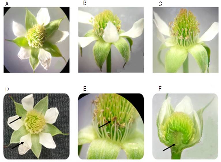 Figure 2: Floral morphology of Rubus glaucus. A. Regular actinomorphic flower; B. Perianth flower; C. Heterochlamydeous; D. Dialisepal-Dialipetal; E. Intrusive anther; F. Hypogynous ovary