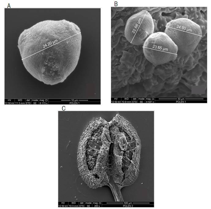Figure 3: Scanning electron microscopy of pollen grains and Rubus glaucus anthers. A. Tricolpored pollen grain; B. Pollen grains; C. Anther.