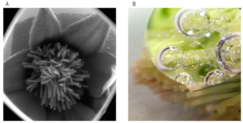 Figure 4: Appearance of stigma and production of bubbles during stigma receptivity test. A. Rubus glaucus multiple stigma (30×); B. Production of bubbles in R. glaucus stigma on reaction with hydrogen peroxide.