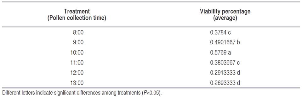 Pollen viability data showed a normal distribution and coefficient of variation of 6.77%. Analysis of variance showed highly significant differences in terms of pollen viability according to the collection time. Regarding differences in pollen viability according to the collection time, Tukey’s test showed that the highest pollen viability was obtained at 10:00 am, followed by at 9:00 am and then 11:00 am. Pollen viability percentages at 9:00 and 10:00 am were significantly different from each other and different from other collection time. However, pollen viability was similar at 8:00 and 11:00 am. Likewise, pollen viability at 12:00 and 1:00 pm were similar, with the latter having the lowest pollen viability percentage (Table 1).