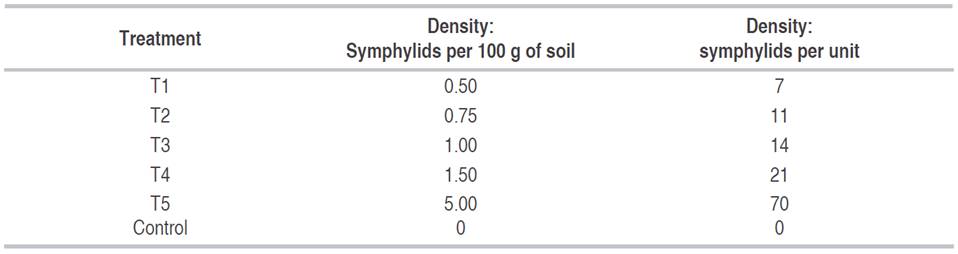 This test aimed at determining the number of symphylids per plant (density) that will cause a measurable reduction in plant height and root dry weight to then established the number of symphylids required for the greenhouse-based pathogenic test. Here the test unit was a 40×14 cm cylindrical glass container filled 1,400 g of soil. In each unit, two chrysanthemum seedlings - Anastasia White variety susceptible to this pest - were planted with different densities of symphylids, the negative control consisted of only the seedlings without symphylids (Table 1). The seedlings were irrigated with 140 mL of fertilizer solution to promote growth and to simulate field conditions. The top of each glass cylinder was covered with a white tulle fabric to prevent symphylid escape. The response variables evaluated were the height of the plant and root dry weight. Plant height was measured with a Stanley fIexometer starting from the neck of the root to the terminal bud. Root dry weight was established in eight repetitions with two seedlings by cutting the roots up to the neck of the stem. The roots were washed and dried in an oven at 70 °C for 72 hours and then weighed on an analytical balance. The plant measurements were taken 24 days after infestation with the pest, by which time the symphylid attack symptoms on the plant were visible.